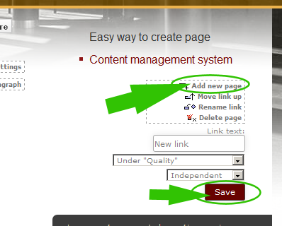 When in right spot, just click "Add new page" to open new page creation dialog. You may write link text and choose what kind of page you would like to create. With clicking "Save" button, new page will be created and you may proceed with editing it's content. Content management system offers you straight way to create new page, without overwhelming you with unnecessary details.